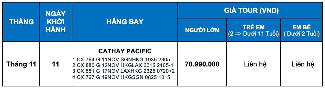 Chiều: Hướng dẫn viên đón Quý khách vào lúc 16h35 tại ga đi Quốc tế làm thủ tục xuất cảnh đáp chuyến bay CX764 SGNHKG 19h35 – 23h05. Quý khách dùng bữa trên máy bay. Đoàn quá cảnh tại sân bay Quốc tế Hồng Kông. Quý khách tiếp tục làm thủ tục nối chuyến bay CX880 HKGLAX 00h05 – 21h05 đi sân bay Los Angeles.