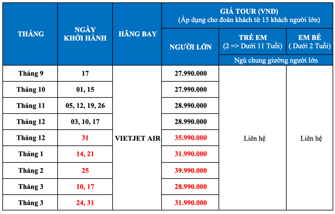 * Lịch khởi hành đến hết Tháng 3/2024: Vui lòng xem chi tiết ở phần nội dung chương trình bên dưới.