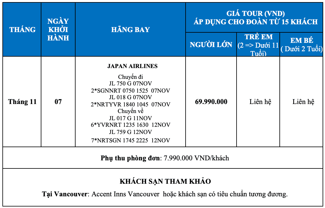 Sáng: Đoàn dùng điểm tâm và di chuyển đến sân bay làm thủ tục cho chuyến bay YVR-SGN. Chuyến bay dự kiến