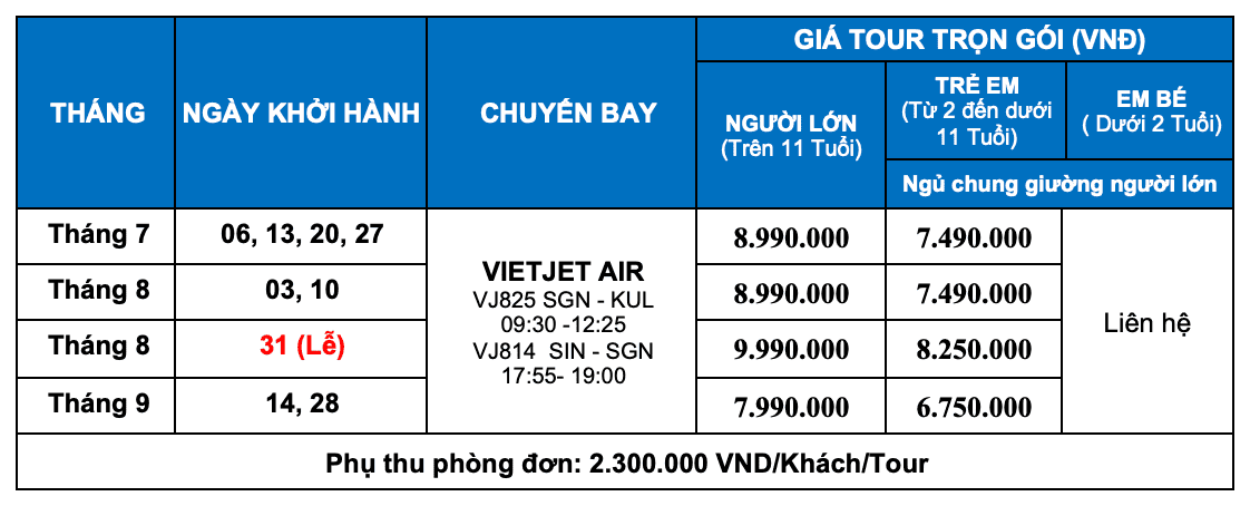 Sáng :Trưởng đoàn đón Quý khách tại sân bay quốc tế Tân Sơn Nhất, làm thủ tục khởi hành đi Malaysia trên chuyến bay VJ825 lúc 09h30. Tới sân bay quốc tếKuala Lumpur, đoàn làm thủ tục nhập cảnh.