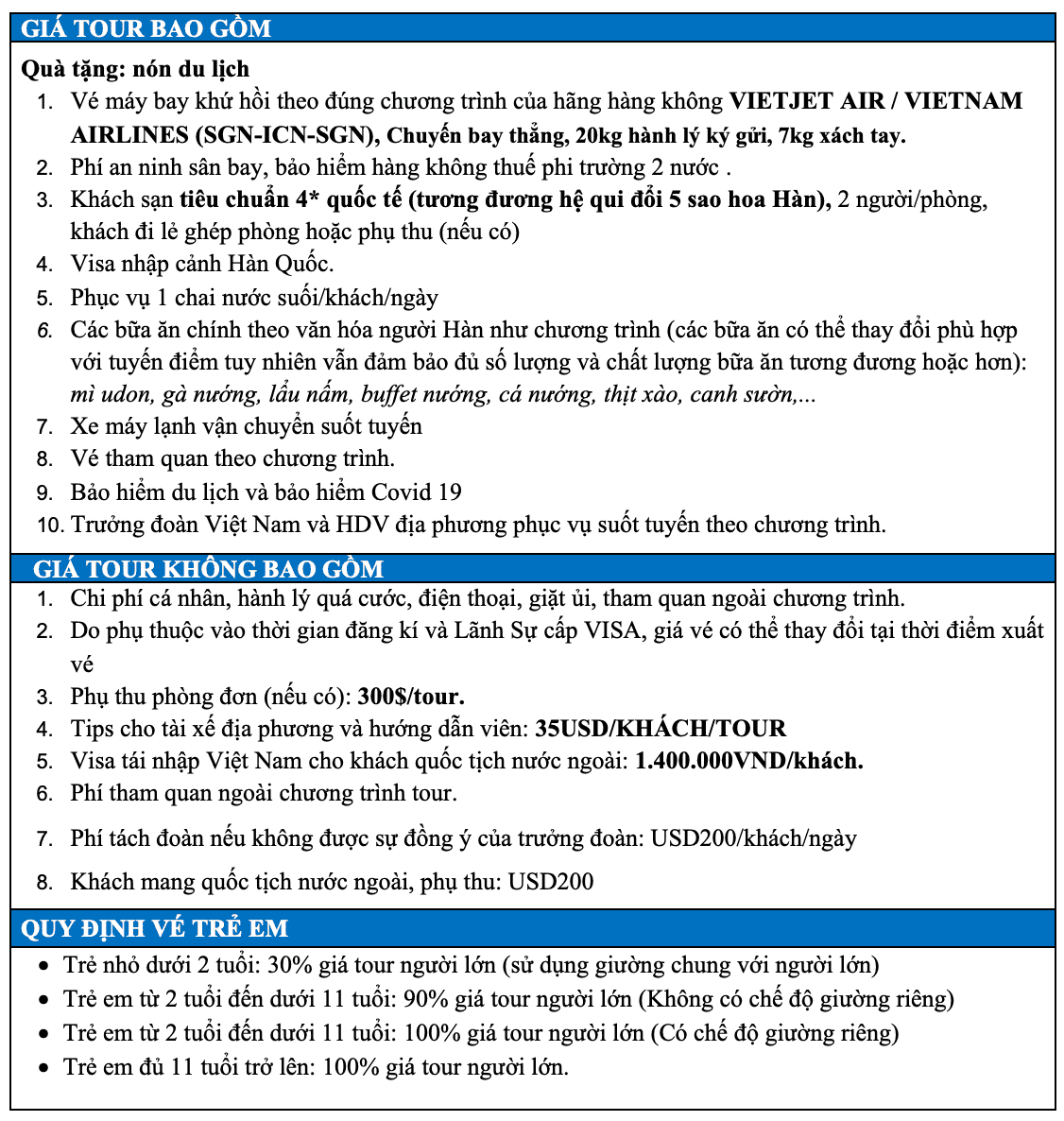 Sau đó, tiếp tục ra sân bay Incheon làm thủ tục đáp chuyến bay về sân bay Tân Sơn Nhất. Về đến sân bay Tân Sơn Nhất đoàn làm thủ tục nhập cảnh Việt Nam và nhận lại hành lý cá nhân. Trưởng đoàn chào tạm biệt quý khách và hẹn gặp lại.