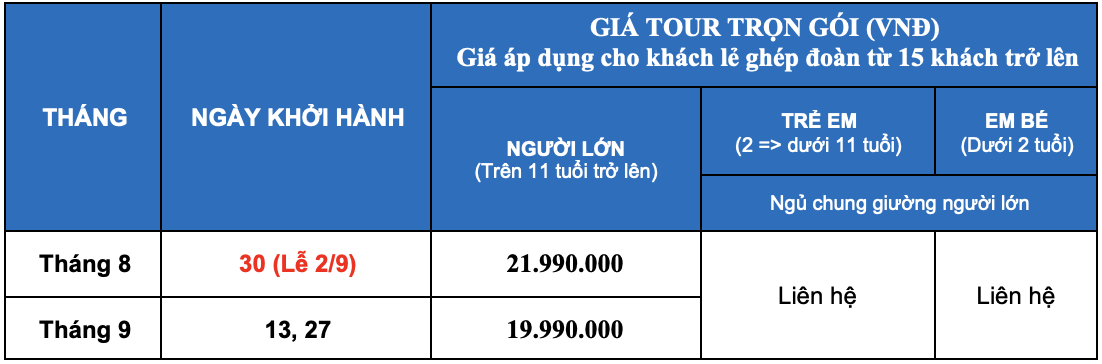 * Lịch khởi hành: 30/8 (Lễ 2/9), 13/9, 27/9