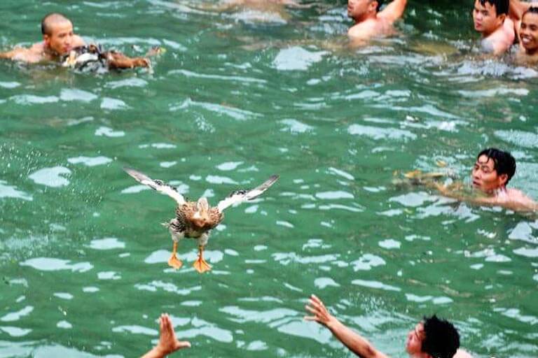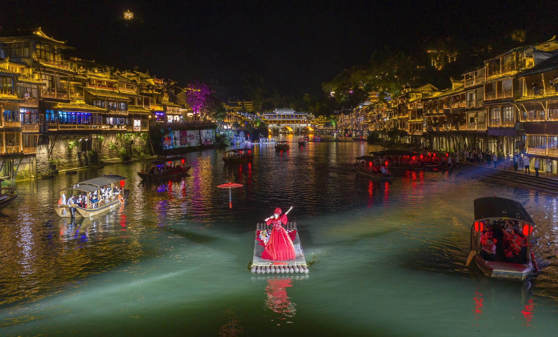 Chắc chắn là điểm nhấn phải trải nghiệm, đi thuyền dọc theo con sông, bạn có thể nhìn thấy các nhà sàn, cung Vạn Thọ, tháp Vạn Danh, những ngôi nhà kiến trúc Điếu cước lâu... các kiến trúc dọc theo bờ sông để cảm nhận sự bình yên, rời xa thế giới ồn ào. Khi con thuyền từ từ trôi làm rung chuyển bóng người trong làn sóng nhẹ nhàng, thời gian chậm lại, bạn sẽ cảm thấy như đã trở thành một phần trong bức tranh phong cảnh tuyệt đẹp của Phượng Hoàng cổ trấn.