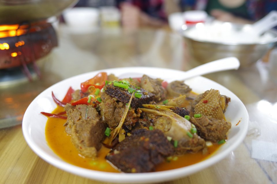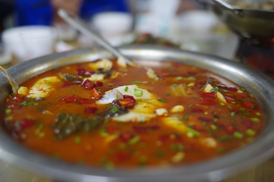 Lẩu cá cay - Vì khí hậu ở Phượng Hoàng trấn se se lạnh nên các món ở đây hầu như đều mang vị cay nồng ấm áp. Trong số những món ăn làm ấm bụng của người dân nơi đây thì phải kể đến món lẩu cá cay, còn được xem là đặc sản của vùng đất này. Cá được đánh bắt từ sông Đà Giang ngay tại thị trấn và đem đi chế biến ngay nên món ăn vẫn giữ nguyên được vị ngọt, tươi và thịt cá dai, bùi hấp dẫn. Không giống như nước ta, ăn lẩu phải kèm bún, mì… ở đây người ta lại ăn lẩu cùng với cơm trắng.