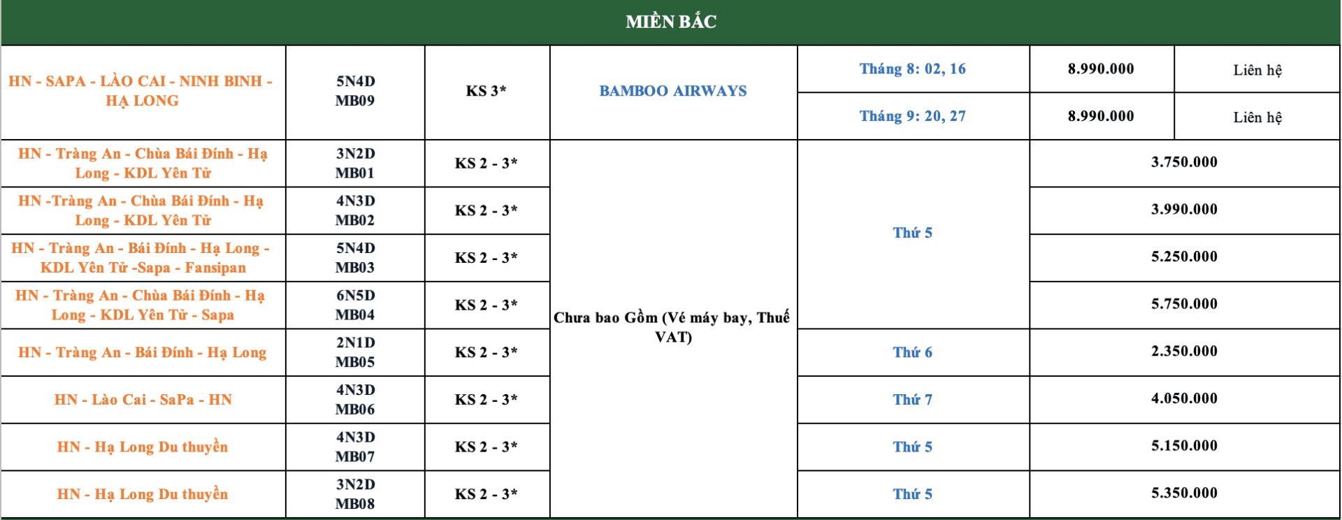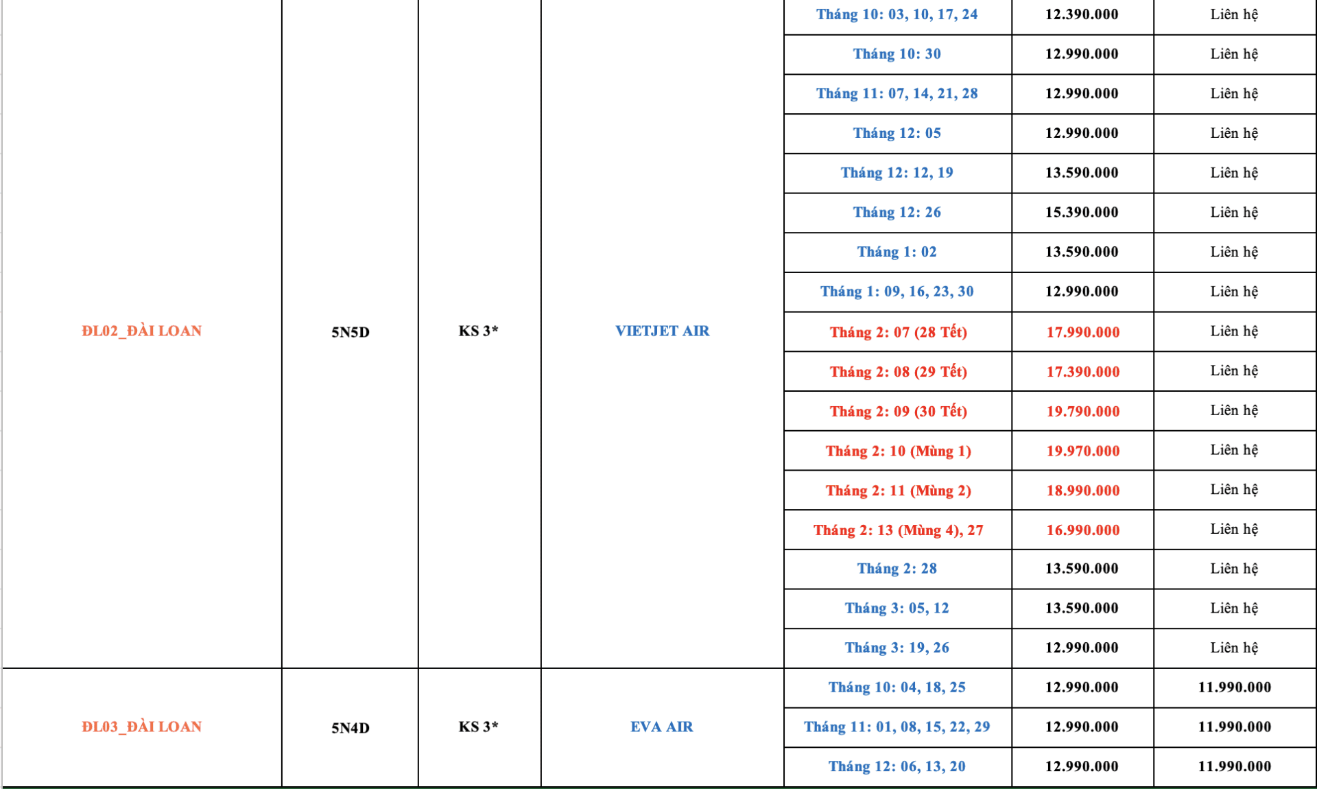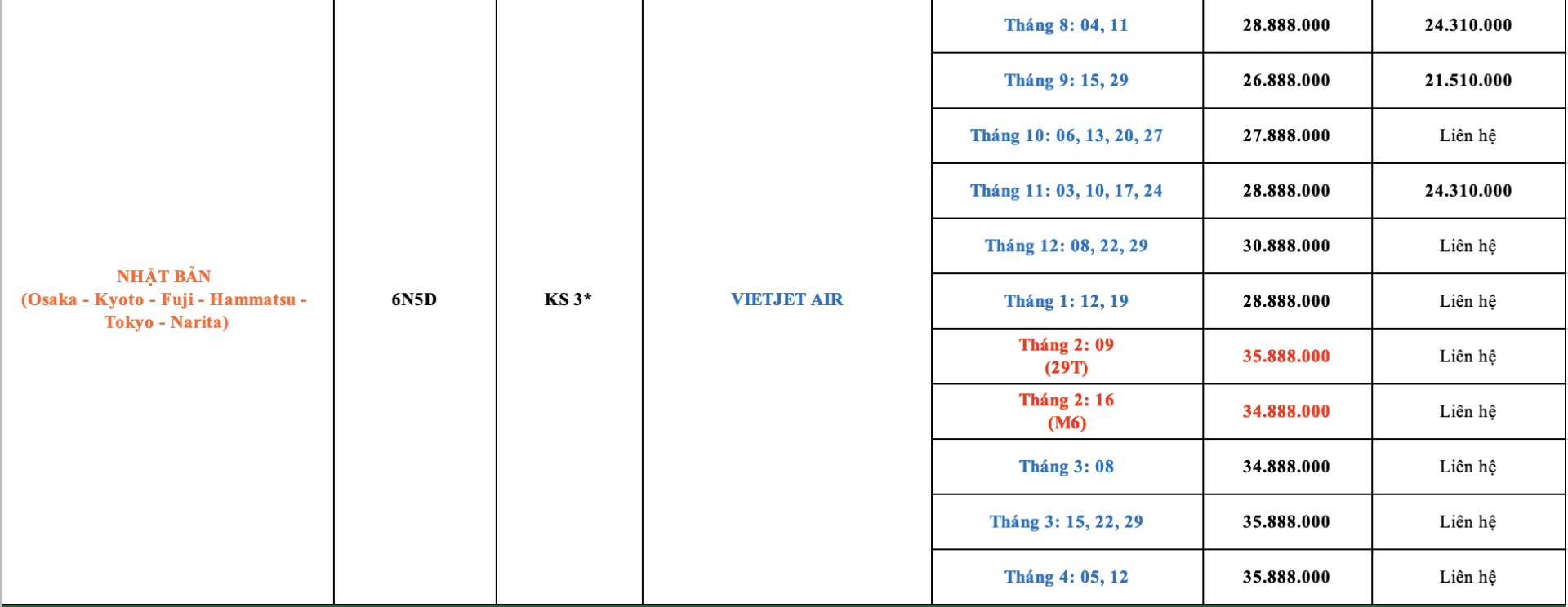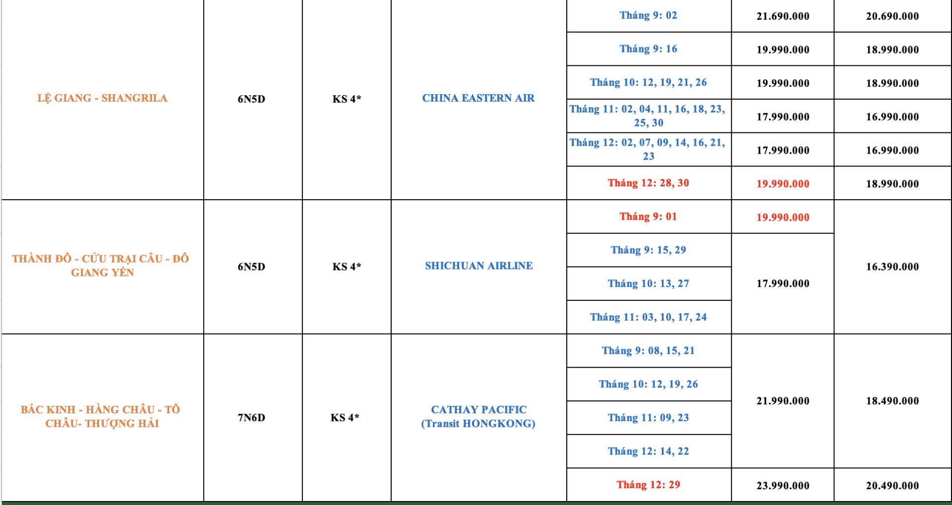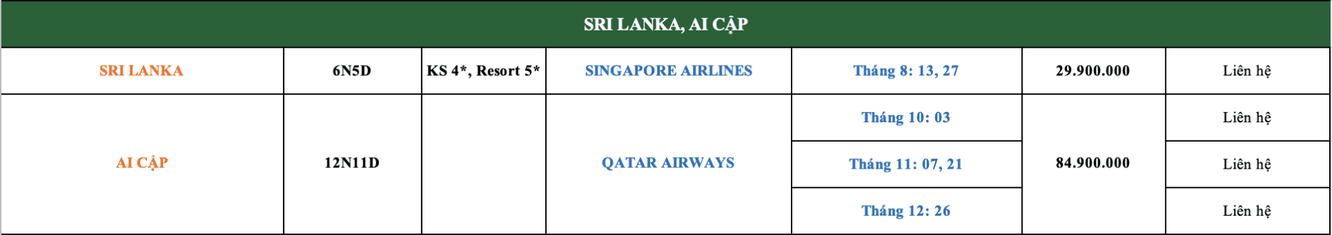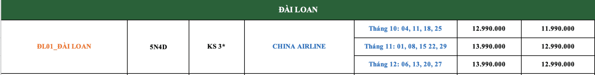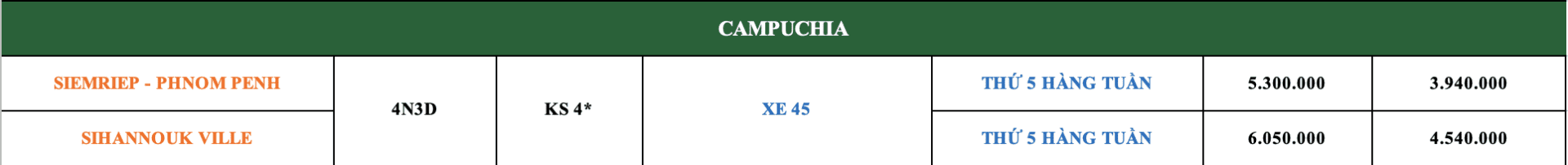 LỊCH KHỞI HÀNH