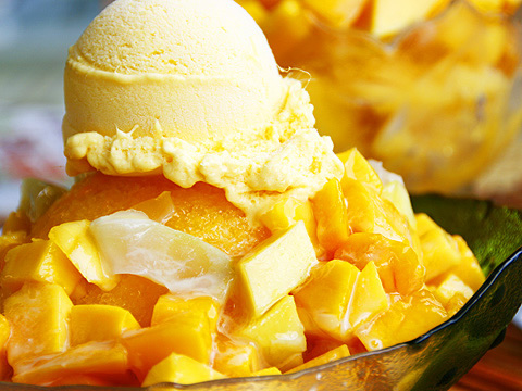 Vào mùa hè, món ăn này được bày bán khắp nơi. Kem xoài đá bào trông bắt mắt bởi màu vàng tươi của xoài, trộn cùng lớp đá xay mịn. Trên đỉnh thường có một viên kem béo ngậy.