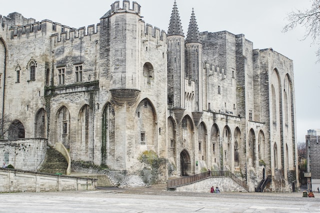- Chụp ảnh bên ngoài Cung điện giáo hoàng Palais des Papes, một trong những cung điện lớn nhất châu Âu, từ năm 1309.
