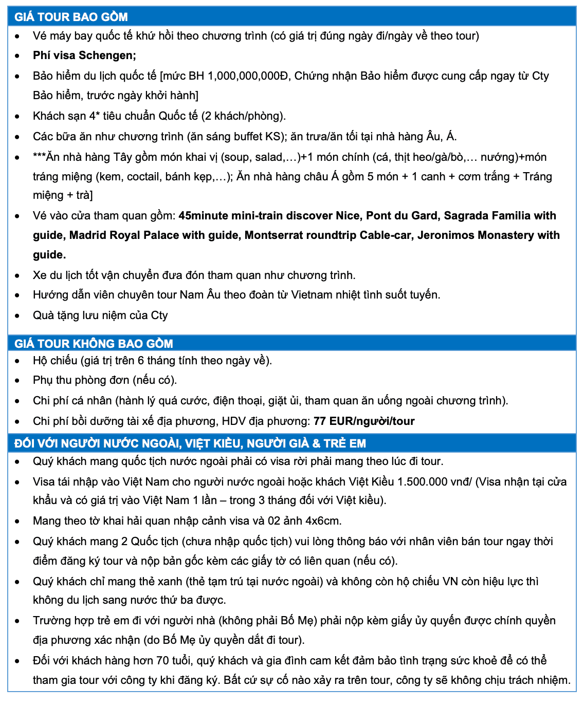 - Tham quan (gồm vé) nhà thờ Sagrada Familia - tráng lệ, được khởi công xây dựng vào năm 1882 với 18 tầng tháp, trải qua hơn một thế kỷ vẫn còn dang dở, di sản Thế giới UNESCO.